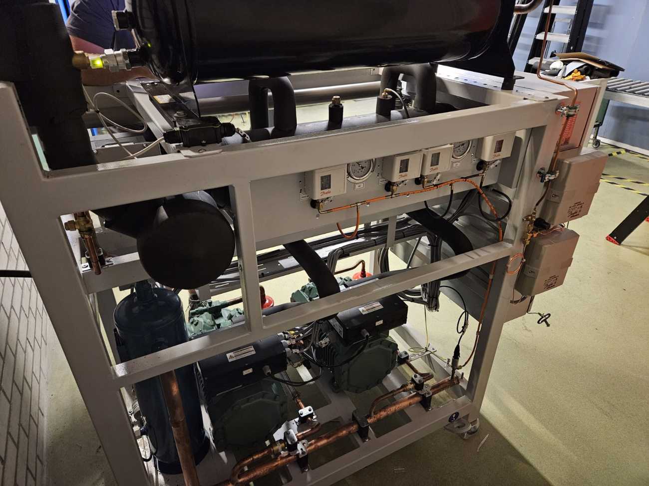 In het eerste stadium van dit project, vorig jaar, hebben we drie verouderde verdampers vervangen door twee grote industriële "Roller" verdampers. Deze nieuwe verdampers bieden een aanzienlijke verbetering in koelcapaciteit en energie-efficiëntie. Dit resulteert in een consistent koelproces dat cruciaal is voor de productie en opslag van hoogwaardige kruidenboter.